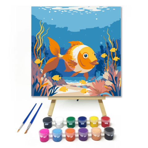 Korallzátony lakói - gyerek számfestő készlet – 20×20 cm (Keretre feszítve) Ez a kép egy vidám halacskát ábrázol, aki boldogan úszkál a korallzátony színes világában. A tenger kékje és a korallok élénk színei igazi kalandot ígérnek a kis festőknek. Tökéle