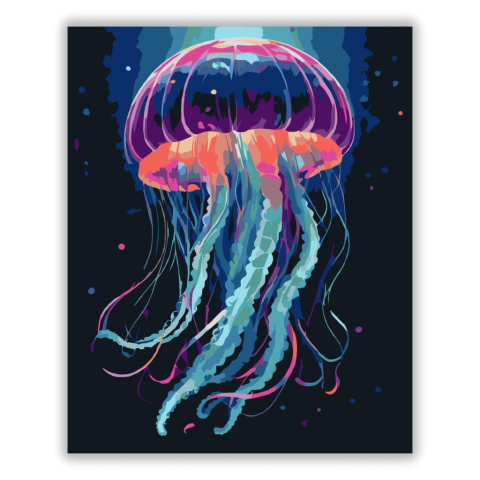 Kozmikus Medúza Élénk Színátmenetekkel - számfestő készlet – 40×50 cm (Keret nélkül) A festmény egy kozmikus medúzát ábrázol, amely színes, fénylő szalagokból és világító csápokból áll. A kompozíció élénk színekben pompázik, mint a teal, rubin, neon lila
