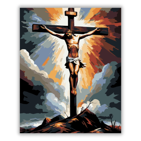 Krisztus Kereszten - számfestő készlet – 40×50 cm (Keret nélkül) A festmény Krisztust ábrázolja a kereszten, drámai kompozícióban és kifejező ecsetvonásokkal. A sötét felhők és az égő fények kontrasztja mély érzelmeket és áldozatot sugall. A kép az önfelá