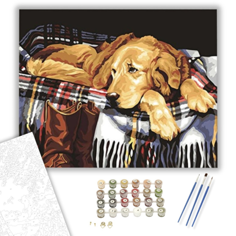 Kutya A Táskában - számfestő készlet – 40×50 cm (Keretre feszítve) A festmény melegséget és meghittséget áraszt, mintha egy hűvös őszi délutánon a kandalló mellé telepednénk. A kép közepén egy elgondolkodtató pillanat bontakozik ki, ahol a nyugalom és a t