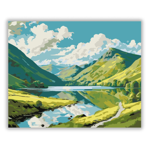 Lake District Tájkép - számfestő készlet – 40×50 cm (Keret nélkül) A festmény az angliai Lake District zöldellő dombjait és a nyugodt tavat ábrázolja, mely visszatükrözi a felhőket. A vibráló zöld és kék színek nyugalmat és frissességet sugároznak. A kép