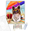 Lazítás - számfestő készlet – 40×50 cm (Keretre feszítve) Ez a festmény vidám és gondtalan hangulatot áraszt, mintha egy nyári napra invitálna a tengerparton. A kép egy történetet mesél el egy pihenő négylábú barátról, aki élvezi a napsütést és a homokos