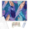 Lebegő Tollak Színkavalkádja - számfestő készlet – 40×50 cm (Keretre feszítve) A festmény különböző színű tollakat ábrázol, amelyek lazán lebegnek a háttér előtt. A színpaletta mély levendulát, rózsaaranyat, lágy indigót és ragyogó akvamarint tartalmaz, a