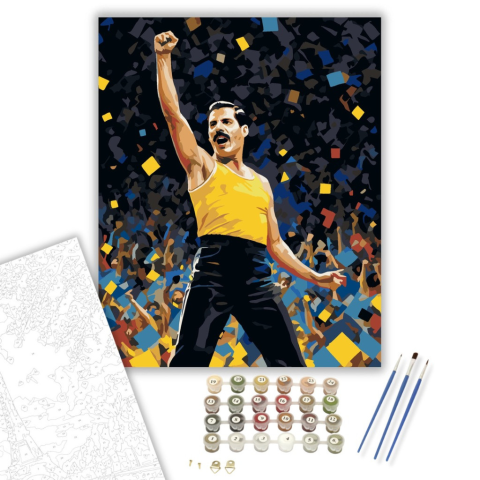 Legendás Énekes Portré - számfestő készlet – 40×50 cm (Keretre feszítve) A festmény egy ikonikus énekest ábrázol, amint karját diadalmasan magasba emeli. A háttér élénk sárga és fekete színekből áll, dinamikus kontrasztot teremtve. Az alkotás az energia é