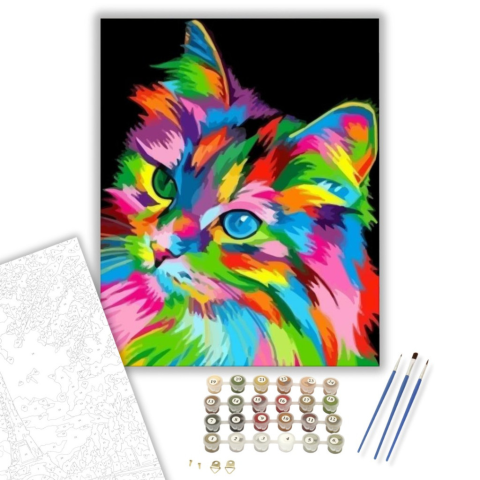 Legszínesebb cica - számfestő készlet – 40×50 cm (Keretre feszítve) Készíts gyönyörű műalkotásokat, előzetes festő tudás nélkül! Éld át az alkotás gyönyörű pillanatait és varázslatos hangulatát! Akkor is gyönyörű festményeket hozhatsz létre, ha még nem fe