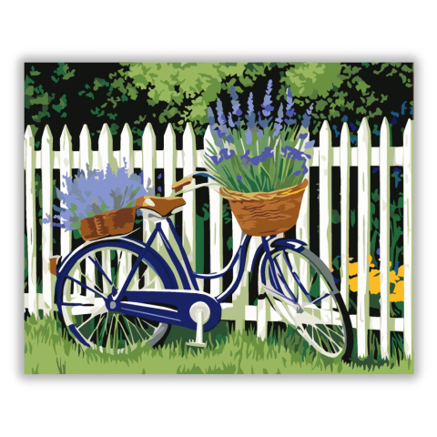 Levendulás Kerékpár Álom - számfestő készlet – 40×50 cm (Keret nélkül) A festmény egy romantikus jelenetet ábrázol, ahol egy kerékpár kosaraiban levendulák virítanak egy fehér kerítés előtt. Az élénk kék és zöld színek kombinációja lendületes ecsetvonások