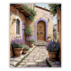 Levendulával Szegélyezett Európai Udvar - számfestő készlet – 40×50 cm (Keret nélkül) A festmény egy hangulatos európai udvart ábrázol, ahol levendulákkal teli kaspók szegélyezik a macskaköves utat, mely egy kis fa ajtóhoz vezet. A lila és zöld színek har