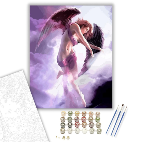 Lila angyal - számfestő készlet – 40×50 cm (Keretre feszítve) A kép egy misztikus, lebegő érzést kelt, mintha az angyal maga is a felhők között táncolna. Egy történet bontakozik ki a szemünk előtt, ahol az égi lények érzelmei és gondolatai találkoznak. A