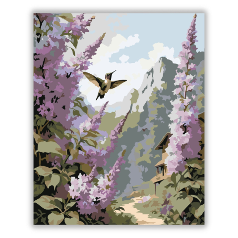Lila Orgonák és Kolibri - számfestő készlet – 40×50 cm (Keret nélkül) A festmény egy tavaszi kertet ábrázol, tele lila orgonákkal, ahol egy apró kolibri lebeg a levegőben, nektárt szívogatva a virágokból. A lila és zöld színek harmóniája természetes és bé