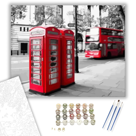 Londoni telefonfülke - számfestő készlet – 40×50 cm (Keretre feszítve) Készíts gyönyörű műalkotásokat, előzetes festő tudás nélkül! Éld át az alkotás gyönyörű pillanatait és varázslatos hangulatát! Akkor is gyönyörű festményeket hozhatsz létre, ha még nem