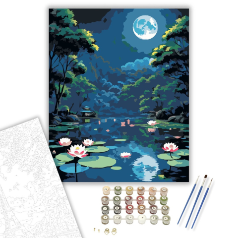Lótusz Lámpások Holdfényes Éjszakán - számfestő készlet – 40×50 cm (Keretre feszítve) A festmény holdfényes éjszakát ábrázol, ahol lótusz formájú lámpások lebegnek a folyón, tükröződve a vízben. A kék és zöld árnyalatok nyugodt és misztikus hangulatot ter