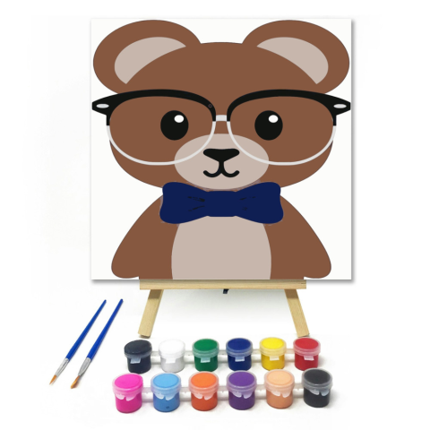 Mackó - gyerek számfestő készlet – 20×20 cm (Keretre feszítve) Ez a kép egy cuki mackót ábrázol, aki szemüvegben és csokornyakkendőben mosolyog rád. A barátságos barna és kék színek vidám hangulatot árasztanak. Tökéletes választás a gyerekek első kreatív