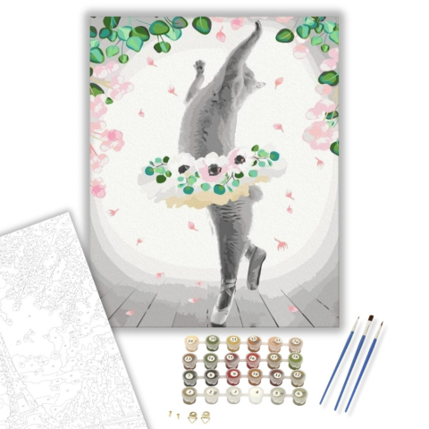 Macska Balerina - számfestő készlet – 40×50 cm (Keretre feszítve) Készíts gyönyörű műalkotásokat, előzetes festő tudás nélkül! Éld át az alkotás gyönyörű pillanatait és varázslatos hangulatát! Akkor is gyönyörű festményeket hozhatsz létre, ha még nem fest