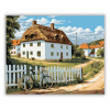 Magyar Falu Hétköznapi Élete - számfestő készlet – 40×50 cm (Keret nélkül) A festmény egy magyar falusi utcát ábrázol, ahol egy bicikli támaszkodik a kerítésnek, és hagyományos fehérre meszelt házak sorakoznak. A színek világosak és természetesek, a kék é