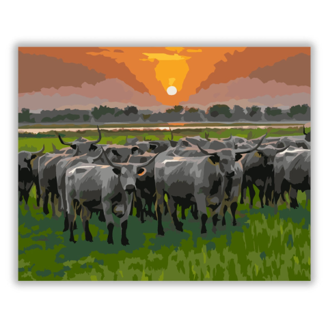 Magyar Szürkemarhák a Tisza-parton - számfestő készlet – 40×50 cm (Keret nélkül) A festmény magyar szürkemarhák csordáját ábrázolja a Tisza folyó közelében, háttérben a lenyugvó nappal. A meleg naplemente árnyalatai és a szarvak sziluettjei nyugodt, vidék