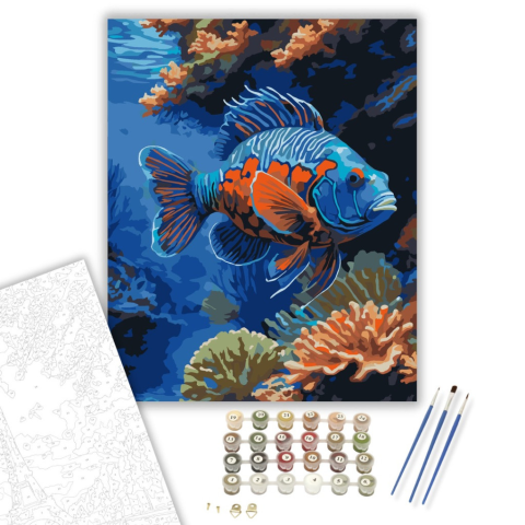 Mandarinhal a Korallzátonynál - számfestő készlet – 40×50 cm (Keretre feszítve) A festmény egy mandarinhalat ábrázol, amint kecsesen úszik egy korallzátony közelében. A hal élénk kék, narancs és zöld mintái ragyognak a lágy víz alatti fényben. A kép a ten