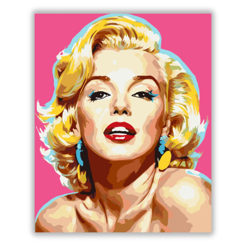 Marilyn Monroe Pop Art Portré - számfestő készlet – 40×50 cm (Keret nélkül) A festmény Marilyn Monroe-t ábrázolja a pop art stílus jellegzetes, élénk színeivel és eltúlzott vonásaival. A sárga haj és a rózsaszín háttér kontrasztja modern, vibráló hangulat