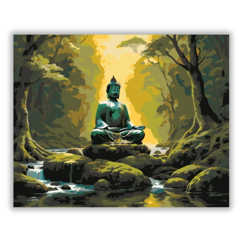 Meditáló Buddha a Természet Közepén - számfestő készlet – 40×50 cm (Keret nélkül) A festmény egy meditáló Buddha alakot ábrázol, aki moha borította sziklán ül egy lassan áramló patak közepén, körülötte lógó ágak és aranyló napsütés. A zöld és arany színár