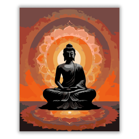 Meditáló Buddha Mandalával - számfestő készlet – 40×50 cm (Keret nélkül) A festmény egy meditáló Buddha sziluettjét ábrázolja egy ragyogó narancs mandala előtt, amelyet egy színátmenetes naplemente háttér egészít ki. A meleg narancs és sötét árnyalatok ny