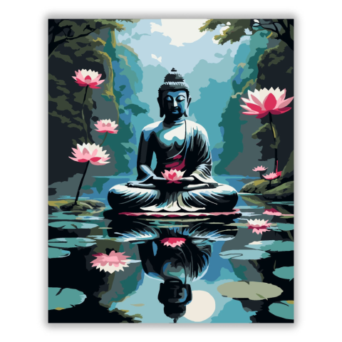Meditáló Buddha Tükröződő Lótuszon - számfestő készlet – 40×50 cm (Keret nélkül) A festmény Buddhát ábrázolja meditációban, egy lebegő lótuszon, amely tökéletes kört formál a víz tükrében. A színek nyugodt kék és zöld árnyalatok, rózsaszín lótuszokkal, me