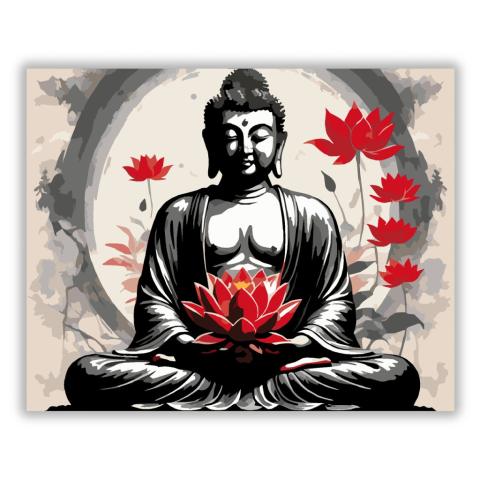 Meditáló Buddha Vörös Lótuszokkal - számfestő készlet – 40×50 cm (Keret nélkül) A festmény egy meditáló Buddhát ábrázol, aki vörös lótuszokkal körülvéve ül. A fekete-fehér árnyalatú Buddha alakja kontrasztot alkot a fényes vörös virágokkal, és emelkedett