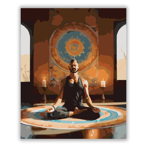 Meditáló Férfi Mandalával - számfestő készlet – 40×50 cm (Keret nélkül) A festmény egy meditáló férfit ábrázol lótuszülésben, egy napfényes jógastúdióban, ahol egy nagy mandala díszíti a falat, és gyertyák sorakoznak a padlón. A meleg narancs és kék árnya