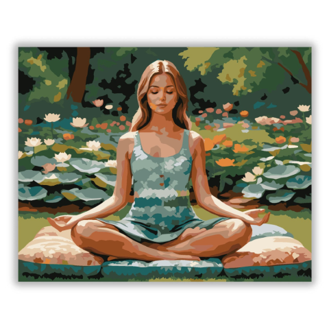 Meditáló Lány Virágkertben - számfestő készlet – 40×50 cm (Keret nélkül) A festmény egy fiatal lányt ábrázol lótuszülésben, amint meditál egy virágokkal teli kertben. A pasztell színek és a lágy tónusok békés, harmonikus hangulatot teremtenek. A kép a bel