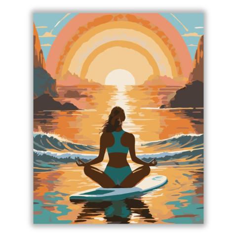 Meditáló Nő a Tengeren Aranyórában - számfestő készlet – 40×50 cm (Keret nélkül) A festmény egy nőt ábrázol lótuszülésben egy paddleboardon, a nyílt tengeren, gyengéd hullámok közt, aranyóra fényében. Az élénk arany és kék színek harmonikus, nyugtató hang