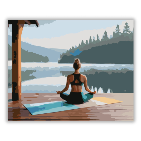 Meditáló Nő a Tónál - számfestő készlet – 40×50 cm (Keret nélkül) A festmény egy meditáló nőt ábrázol egy tóparti fapallón, körülötte csendes, ködös táj. A kép finom kék és zöld árnyalatokkal teremti meg a természetes nyugalom hangulatát. A kompozíció a b