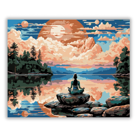Meditáló Nő Tóparti Naplementében - számfestő készlet – 40×50 cm (Keret nélkül) A festmény egy meditáló nőt ábrázol, aki egy napsütötte sziklán ül a tóparton, ahol a víz tükrözi a barack színű felhőket és a korai csillagokat. A kép színvilágát a meleg nar