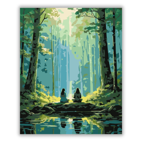 Meditáló Nők Erdőtisztáson - számfestő készlet – 40×50 cm (Keret nélkül) A festmény két meditáló nőt ábrázol egy erdei tisztáson, ahol lebegő fényrészecskék és gyenge köd veszi körül őket. A zöldek és kékek dominálnak, nyugalmas és harmonikus atmoszférát