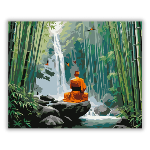 1 kép Számfestő.hu Meditáló Szerzetes a Vízesésnél Bambuszerdőben - számfestő készlet