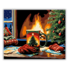 Meghitt Karácsonyi Esték - számfestő készlet – 40×50 cm (Keret nélkül) A kép középpontjában egy ünnepi mintás bögre áll, körülötte meleg ruhadarabok pihennek, míg a háttérben egy karácsonyfa díszeleg vörös gömbökkel. A lobogó kandalló lángjai és a hóval b