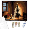 Meghitt Téli Ünnep - számfestő készlet – 40×50 cm (Keretre feszítve) A kép egy bensőséges szobabelsőt mutat be, ahol egy gyönyörű karácsonyfa áll a szoba sarkában, csillogó csúcsdísszel a tetején. A halványan pislákoló gyertya fénye lágyan öleli körbe a t