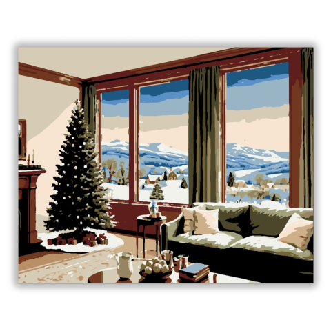 Meghitt Ünnepi Otthon - számfestő készlet – 40×50 cm (Keret nélkül) A képen egy varázslatos téli enteriőr tárul elénk, ahol egy díszes karácsonyfa áll büszkén, körülvéve ajándékokkal, míg a nagy ablakokon túl egy hóborította táj szépsége nyílik meg. A kék