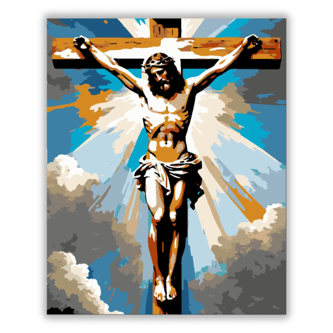 Megváltó Áhítata - számfestő készlet – 40×50 cm (Keret nélkül) A kép közepén a Megváltó alakja emelkedik ki, keresztjén függve, szenvedés és megváltás szimbólumaként. Az égbolt felhői között napfény sugarai törnek át, aranyló ragyogással ölelve körül a je