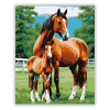 Ménes Anyai Szeretet - számfestő készlet – 40×50 cm (Keret nélkül) A festmény egy gesztenyebarna kancát ábrázol, aki a zöldellő legelőn áll, mellette kiscsikójával. A gazdag zöld és barna árnyalatok nyugodt, természetközeli hangulatot teremtenek. A kép a