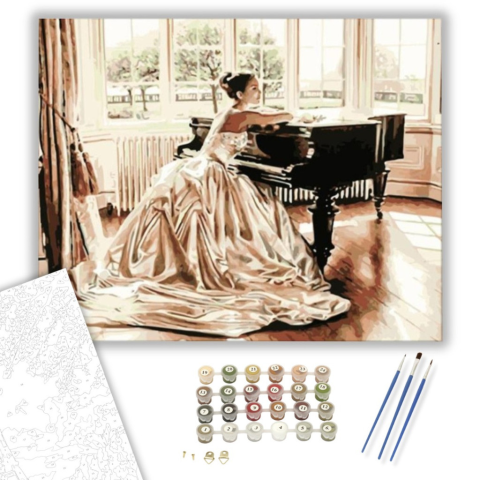 Menyasszony a zongoránál - számfestő készlet – 40×50 cm (Keretre feszítve) Készíts gyönyörű műalkotásokat, előzetes festő tudás nélkül! Éld át az alkotás gyönyörű pillanatait és varázslatos hangulatát! Akkor is gyönyörű festményeket hozhatsz létre, ha még