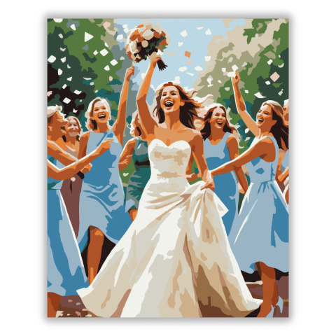 Menyasszony Csokordobás Pillanata - számfestő készlet – 40×50 cm (Keret nélkül) A festmény egy menyasszonyt ábrázol, amint boldogan dobja el a csokrát a nevető koszorúslányok gyűrűjében, miközben szirmok repülnek a levegőben. Az élénk színek és a dinamiku