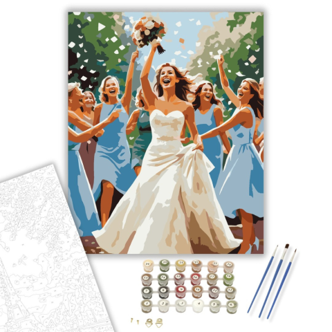 Menyasszony Csokordobás Pillanata - számfestő készlet – 40×50 cm (Keretre feszítve) A festmény egy menyasszonyt ábrázol, amint boldogan dobja el a csokrát a nevető koszorúslányok gyűrűjében, miközben szirmok repülnek a levegőben. Az élénk színek és a dina