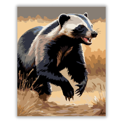 Mézborz a Szavannán - számfestő készlet – 40×50 cm (Keret nélkül) A festmény egy mézborzot ábrázol, amint gyorsan halad a száraz szavannai fűben. A kép árnyalatai a barna és arany színeket kombinálják, kiemelve a természetes környezet meleg tónusait. Az a