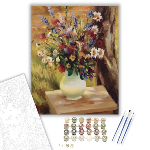 Mezei virágok - számfestő készlet – 40×50 cm (Keretre feszítve) A festmény meleg, nyári hangulatot áraszt, amely azonnal magával ragadja a nézőt. Egy elhagyatott kerti asztalon álló virágcsokor meséli el a természet csendes szépségét. A színek élénk harmó