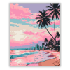 Miami Beach Naplemente - számfestő készlet – 40×50 cm (Keret nélkül) A festmény Miami Beachet ábrázolja naplementekor, pálmafákkal a rózsaszín égbolt előtt és hullámokkal a parton. A színek élénk rózsaszín és kék árnyalatokban pompáznak, meleg és nyugodt