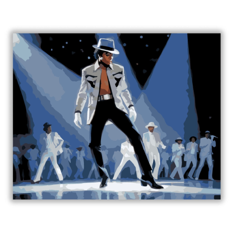 Michael Jackson Moonwalk Portré - számfestő készlet – 40×50 cm (Keret nélkül) A festmény Michael Jackson ikonikus moonwalk pillanatát ábrázolja színpadon, fényekkel megvilágítva. A kép dinamikus és energikus, a híres kalap és kesztyű ezüst csillogással em