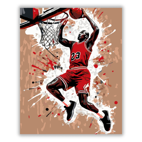 Michael Jordan Legendás Zsákolás - számfestő készlet – 40×50 cm (Keret nélkül) A festmény Michael Jordant ábrázolja, amint zsákolás közben látható, dinamikus mozdulat közepette. Az absztrakt festékfröccsenések és a piros-fekete tónusok az energiát és nagy