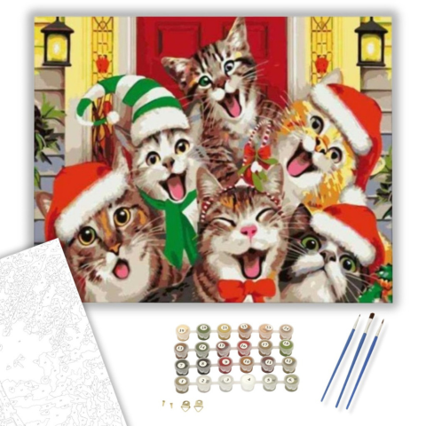 Mikulás Macskák - számfestő készlet – 40×50 cm (Keretre feszítve) Készíts gyönyörű műalkotásokat, előzetes festő tudás nélkül! Éld át az alkotás gyönyörű pillanatait és varázslatos hangulatát! Akkor is gyönyörű festményeket hozhatsz létre, ha még nem fest