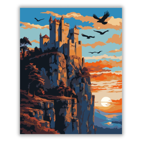 Misztikus Naplemente az Ősi Várnál - számfestő készlet – 40×50 cm (Keret nélkül) A festmény egy ősi várat ábrázol egy szikla tetején, ahol a naplemente hosszú árnyékokat vet a kőfalakra. A narancssárga és kék égbolton hollók repülnek, fokozva a jelenet dr