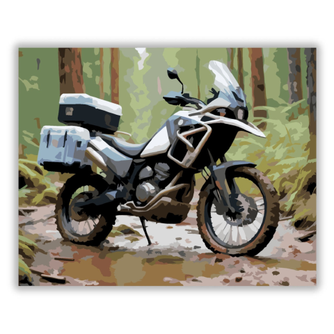 Modern Adventure Túramotor Erdőszélen - számfestő készlet – 40×50 cm (Keret nélkül) A festmény egy modern adventure túramotort ábrázol, amely sárral borítva pihen az erdei ösvény szélén. A motor hátulján csomagok vannak rögzítve, a gumiabroncsokon sár tap