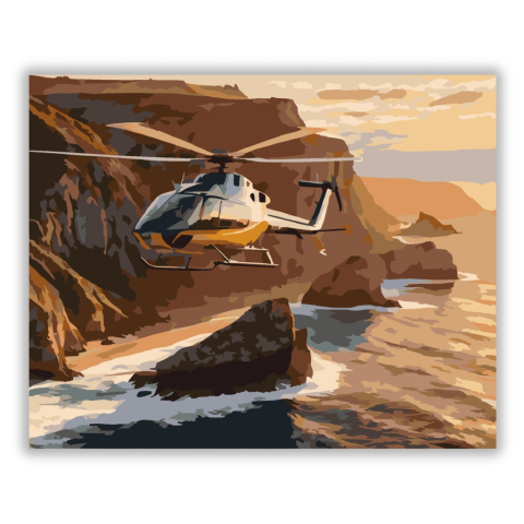 Modern Helikopter a Naplemente Felett - számfestő készlet – 40×50 cm (Keret nélkül) A festmény egy modern helikoptert ábrázol, amely alacsonyan repül a kanyargó tengerpart fölött naplementekor. Az aranyszínű fények és a hullámzó tenger drámai kontrasztot