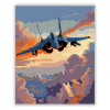 Modern Vadászgép Függőleges Felszállása - számfestő készlet – 40×50 cm (Keret nélkül) A festmény egy modern vadászgépet ábrázol, amely függőlegesen emelkedik a szürkületi égbolt felé. Az ég narancssárga és kék árnyalatai drámai kontrasztot teremtenek, mik